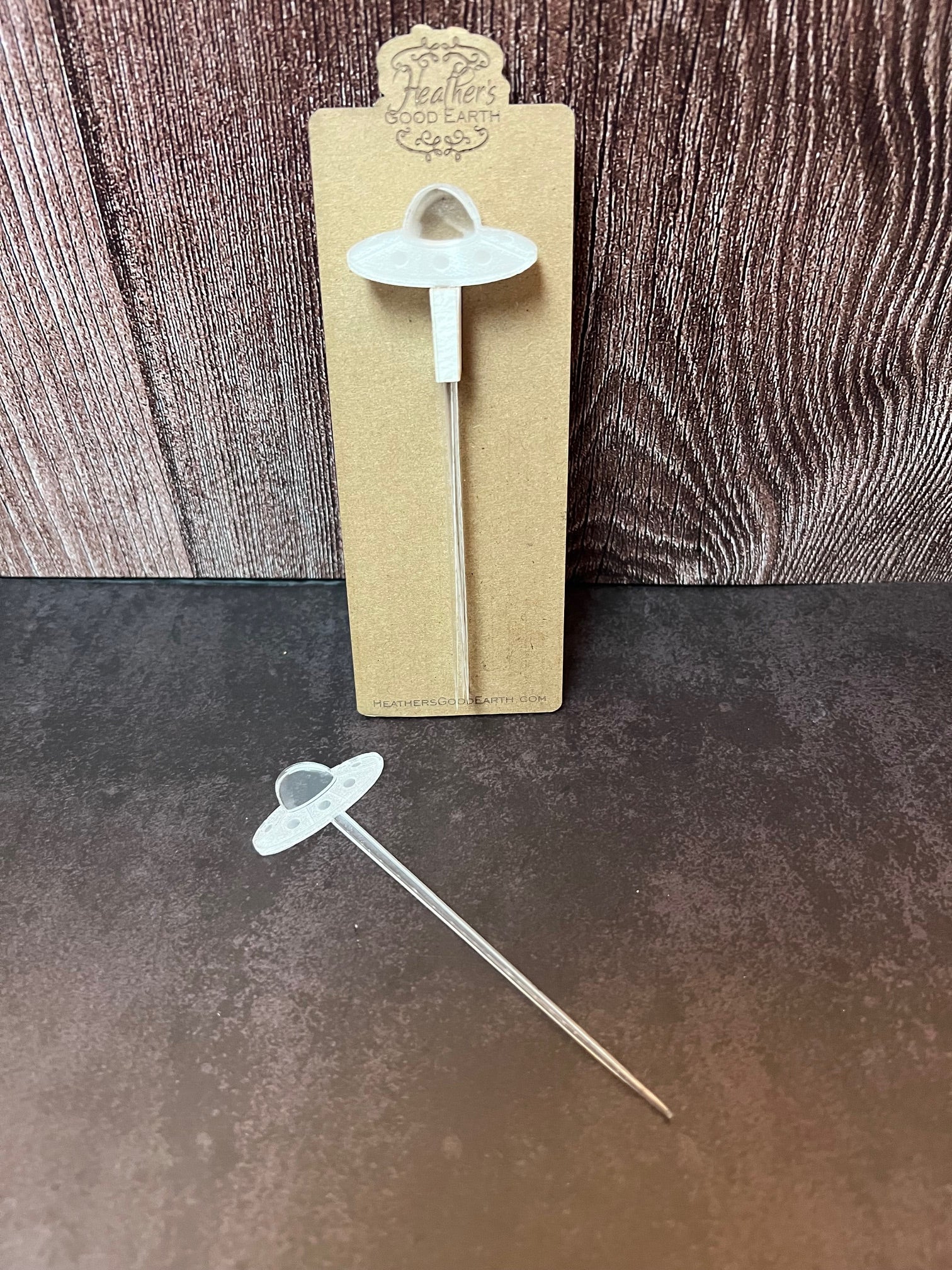 4 3/8" Flying Saucer garnish & hor d'oeurvre picks. Clear Plexiglas cut and etched.
