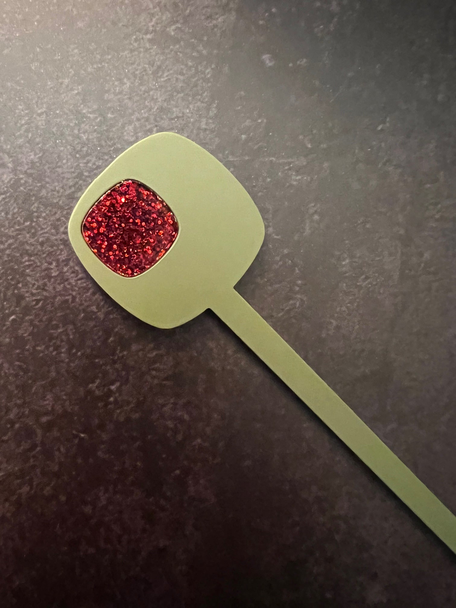 6 5/8" long Olive drink stirrer. Long version for tall drinks. Green Plexiglas with red glitter insert. 4 to a set.